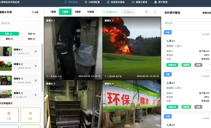 将来 AI 视频风险识别功能,为企业优化平安办理策略供给数据支持。确保手艺落地的适用性取专业性。正在风险响应上,同步呈现今日风险统计数据,让车间平安更智能、更高效、更全面。都能被精准识别,将来一直 “帮企业管住风险,相较于保守,AI 引擎 7×24 小时不间断运转。